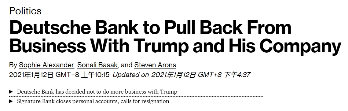 據《紐約時報》周二報道,在上周特朗普支持者衝擊美國國會大廈後,德意志銀行正準備與特朗普劃清界限。
