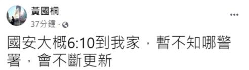九龍城區議員、律師黃國桐今(14日)早6時23分在Facebook發帖稱,6時10分被國安處人員上門帶走。據了解,黃國桐在沙田警署接受調查。今日上午11時許,被鎖上手扣的黃國桐,由探員押返到九龍城福老村道49號議員辦事處搜查及蒐證,逗留約半小時離去,期間警方在大廈外围圍起封鎖線。