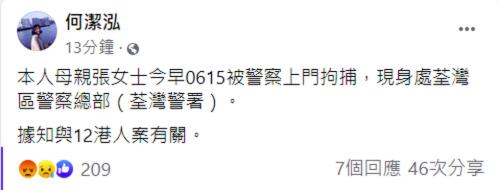 另外,前學聯副秘書長何潔泓亦在fb發帖称,其母張女士今晨6時許被警察上門拘捕,現身處荃灣警署。