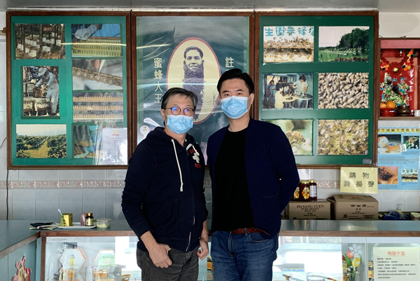 寶生園第三代掌舵人梁立德(左)與筆者合照。中間的商標絕對是香港人的集體回憶,被蜜蜂團團圍住脖子者就是創辦人梁遠湛。葉德平提供圖片