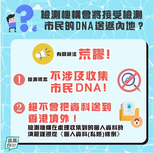 港府今日(15日)在社交平台「添馬台」發文指,近日有人在流動採樣站外,向途人聲稱檢測機構會將市民的DNA送返內地,企圖誤導市民。政府強調,檢測根本不涉及收集市民的DNA,有關説法毫無事實根據,亦完全不科學。