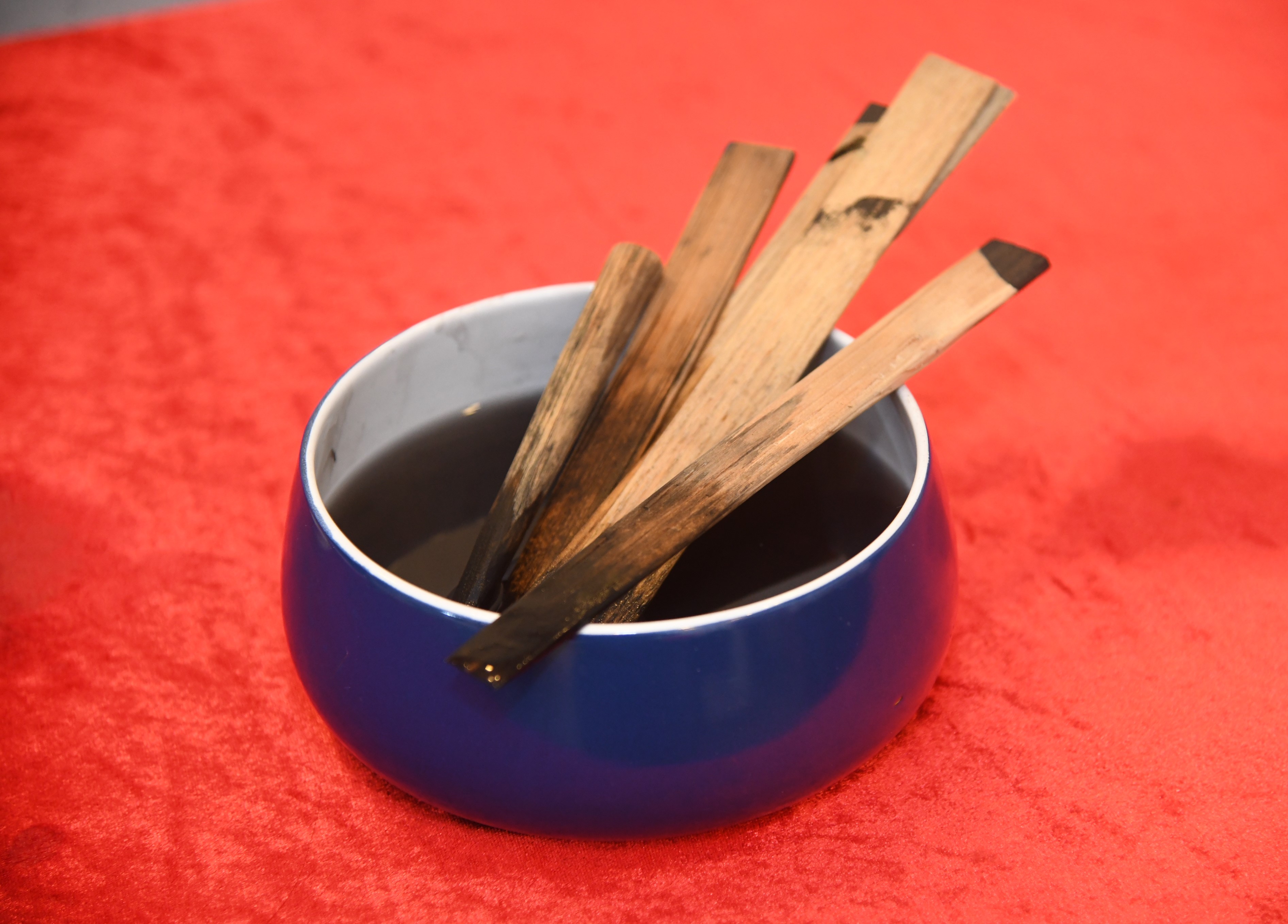 「工欲善其事,必先利其器」,黎家駒不但書法自成一家,所用的書寫工具也與眾不同。「我用的木筆是自己親手製作的,與一般毛筆寫出來的字形不同,木筆能寫出具層次、紋路如絲帶般的字體。」黎氏說,木筆是用一片長條形的實木片製成,在桌上敲擊也不會斷,堅韌而有彈性。如何用木筆寫字,黎氏在訪問後即場示範,先把木筆蘸上墨汁,再以不同的傾斜度落筆,加上提按輕重的變化,形成字體飛白的特色。每個字一筆呵成,線條流暢,轉折處筆畫凸出,燥潤相宜。他之後用普通毛筆再作示範,只見起筆與轉折處稍微加工,點上些龍眼珠、龍鬚,便成為書畫合一的作品。