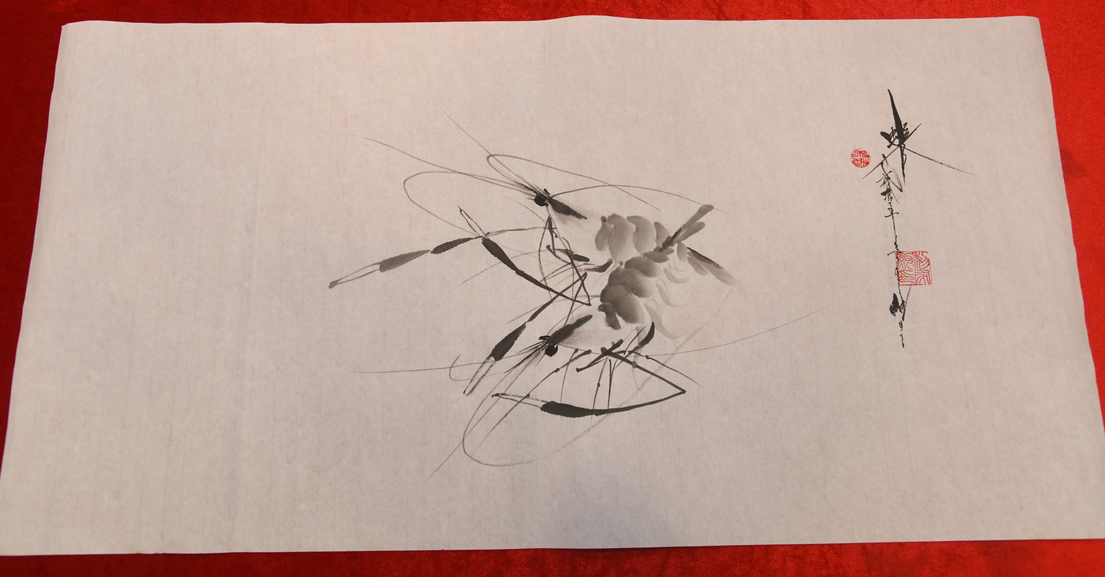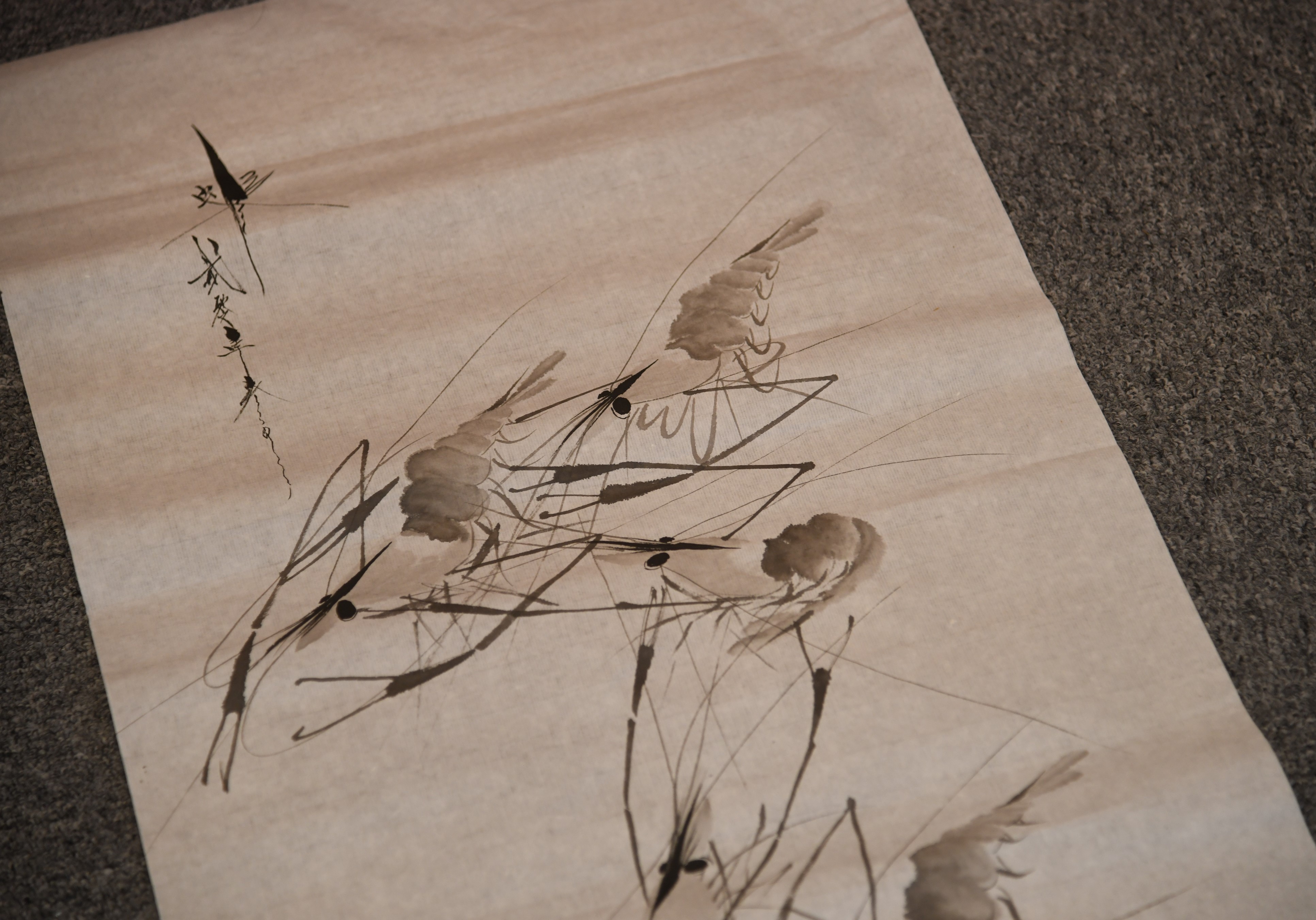 齊白石畫的蝦呈半透明,且每隻形態靈動、輕盈,神態栩栩如生,恍如為每隻蝦賦予了靈魂。黎氏筆下的蝦利用水墨的深淺表現其造型,同樣氣韻生動,有如在水中游動,靈氣十足,體現他對蝦觀察入微。他坦言畫蝦易學難精:「水墨不像油畫,落筆便無法修改或覆蓋。若其中一隻蝦畫粗了,整幅作品就失真了。」黎氏最擅長畫對蝦,兩幅畫作如同鏡面反射,布局幾乎一模一樣,可想而知創作時要有多專注,從中也能看出畫家對藝術的追求與執著。 (撰文:Janice 部分圖片:蔡啟文 場地提供:The AIR (The ONE))