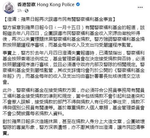《蘋果日報》今日(15日)刊登一篇有關警察福利基金的報道,內容提到基金2019至2020年度獲得1.8億港元捐款,當中涉及580筆捐款,超過85%來自「無名氏」。警方在社交網站發文,批評該報繼去年8月4日,企圖誤導市民有關基金收入來源由徵稅所得後,再次透過失實標題抹黑基金捐款,強調基金捐款按照嚴謹程序審核,每年收入及支出均受嚴謹程序監管。警方對《蘋果》多次造謠抹黑,甚至在捐款人身份上大造文章,企圖破壞警隊的專業形象表示遺憾,希望市民認清事實。