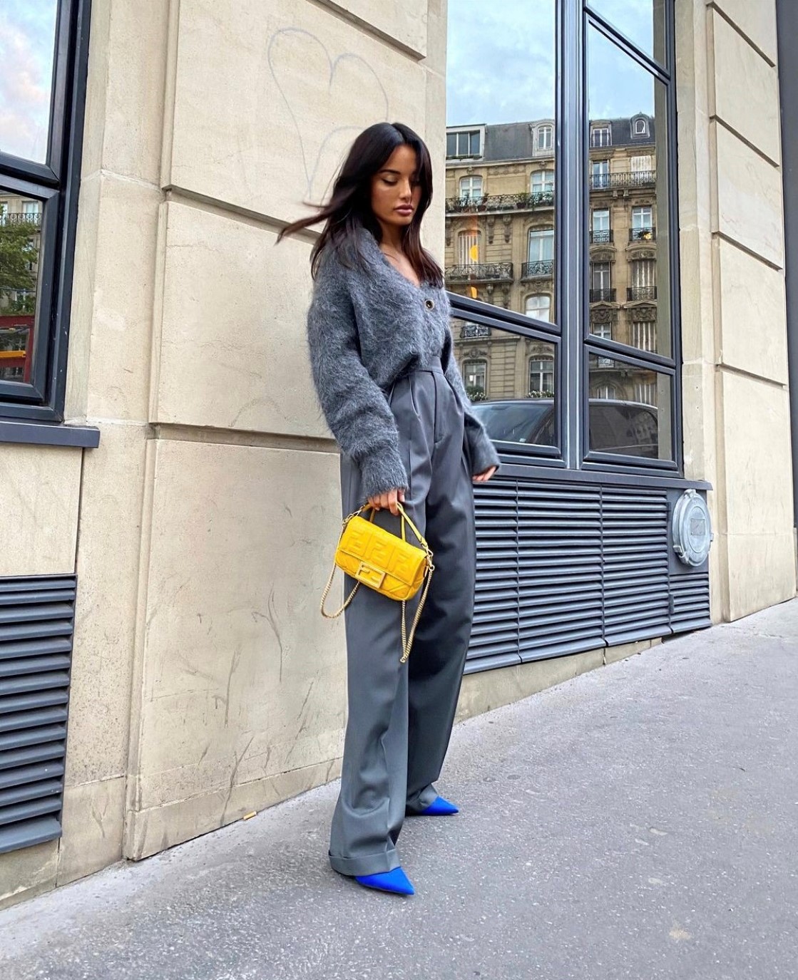 對於行低調型格路線的女生,較少穿著鮮色衣物,其實只要配上單品來襯色,在灰色基礎上以少許亮黃色作點綴,同樣能營造出低調又潮流的風格,例如手袋、鞋子、絲巾等,已讓全身沉穩灰色裝扮顯得獨特。相反,也可以大膽地將一片黃色穿在身上,例如 IG女神倪晨曦一身FENDI的打扮,穿上黃色大衣,配搭灰色腰帶及手袋,別具明亮的氣場。