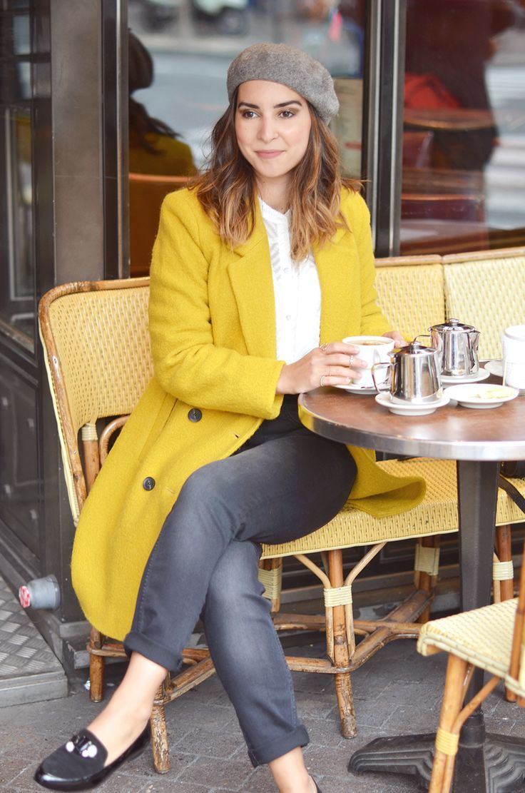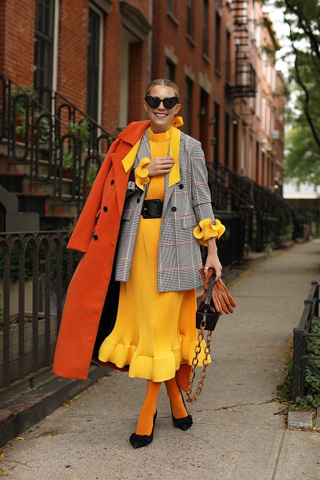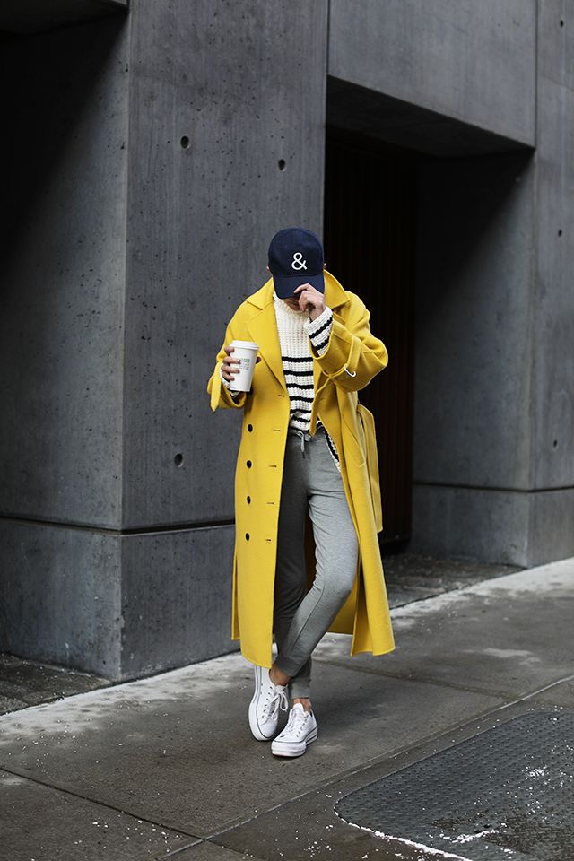 用灰色褲來襯搭上身黃色大衣。(圖:Pinterest)