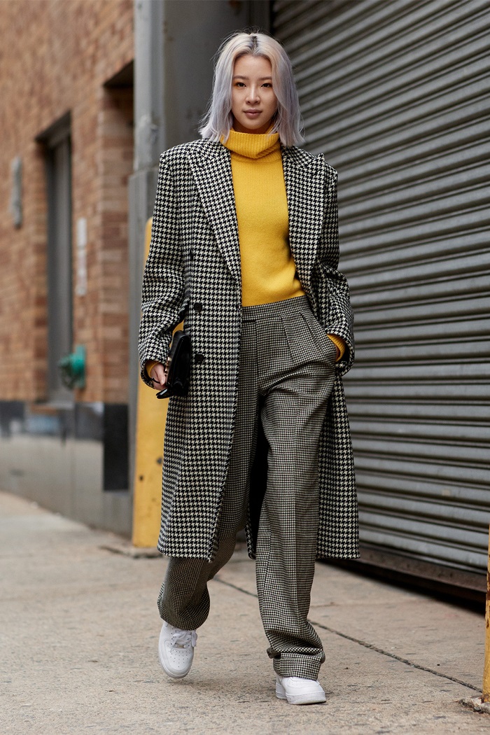 很多潮流達人都會選用灰色格子外套來平衡黃色衣物,這樣顯得更為型格,也算是較為安全的配襯方法。不論是穿裙子、長褲或是內襯針織衫,效果也很好。黃色與灰色各佔一半的造型,沉穩中帶著活力,最適合生氣盎然的春季。(文:Ruth)