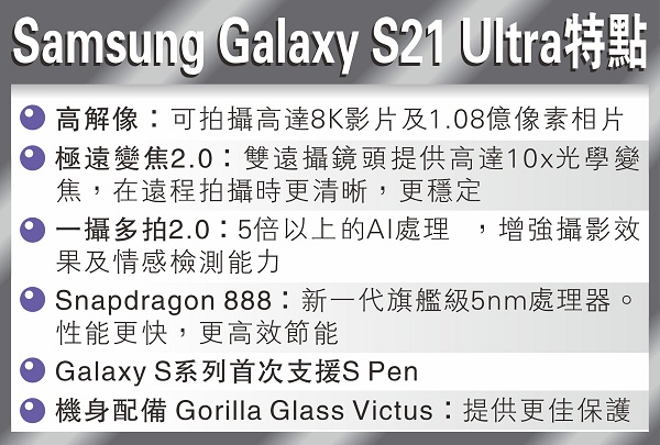 上一代人習慣新年換新衫,這一代人則喜愛新年換新手機。手機生產商亦把握時機,在一年伊始推出新產品吸客。Samsung日前便舉行了Galaxy Unpacked 2021網上發布會,宣布推出旗艦機Galaxy S21系列,此系列分為S21 Ultra、S21+與S21三款型號。主角S21 Ultra是S系列中首部對應S Pen觸控筆的型號,方便用家操作。新機除了在各項硬件上作出改進,在拍攝功能上亦有所提升,讓用家在新一年盡情拍攝新照片,驅走舊有的悶氣。