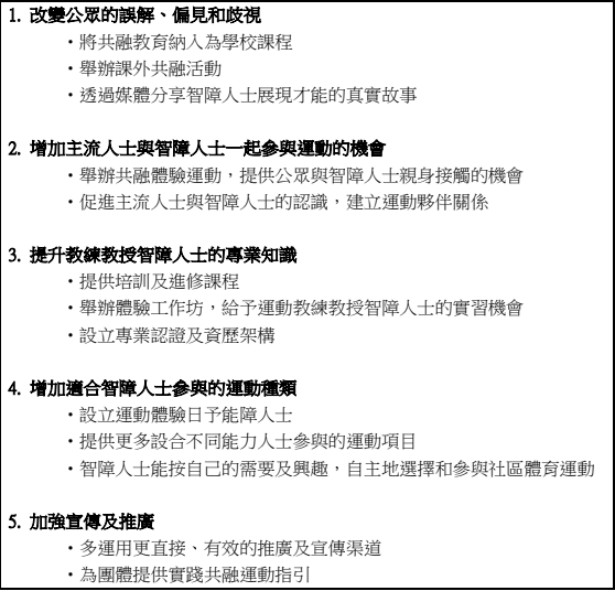 「親切」活動統籌李嘉萱指,調查發現智障人士參與社區運動的情況仍遭受誤解、排斥和歧視;李嘉萱亦認為,現時的政策較側重於完善網站體育活動資訊和租用場地等,但未能為智障人士提供合適及不同種類的體育運動、提升教練對智障人士的專業知識和改變社區人士的既定觀念等,故智障人士至今在參與體育運動上仍充滿障礙。