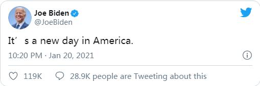 [22:30] 美國當選總統拜登在就職典礼前夕發布推特:這是美國新的一天!(It’s a new day in America.)
