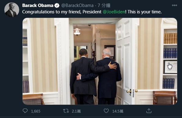 [22:45]美國前總統奧巴馬在推特對當選總統拜登表示祝賀,並稱「這是你的時間了」(This is your time)