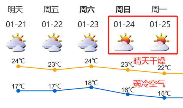 24-25日受弱冷空氣影響,晴天乾燥,氣溫略降,沿海、海區和高地最大陣風6-7級。