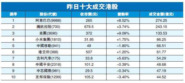 科指破頂跑贏大市,ATM合共貢獻恒指378點,多過大市升幅,多隻成分股升幅顯著。螞蟻集團上市觸礁後,昨日馬雲在兩個多月來首度現身,刺激阿里巴巴(9988)股價急升8.5%。該股又為全日最大成交金額股份,成交多達274.25億元。騰訊(700)再創新高,收市升3.7%,報679.5元,全日獲39.14億元北水淨買。