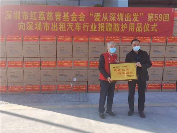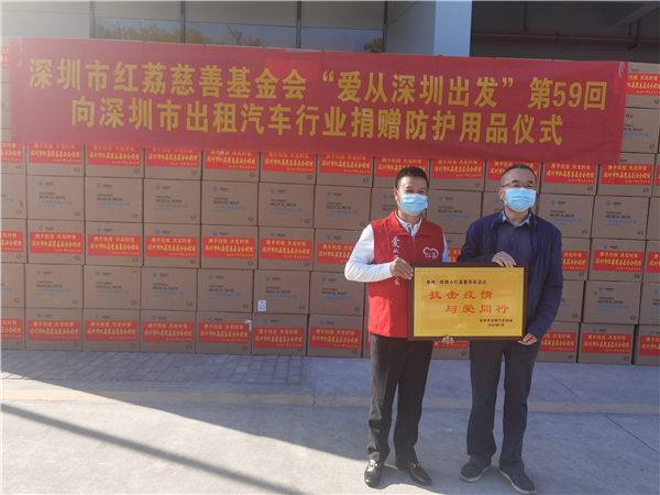 1月21日上午,深圳市紅荔慈善基金會第59次愛心行動「抗擊疫情、與愛同行」捐贈活動在深圳市出租車協會舉行。深圳市紅荔慈善基金會將採購的110萬個防護口罩捐贈給深圳市出租汽車協會,派發給深圳約4萬的士司機。