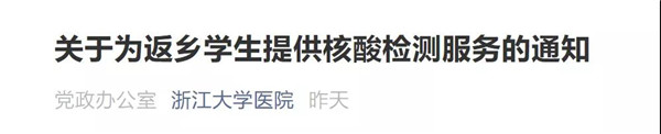 昨日,浙江大學黨委學生工作部等部門發布《關於為返鄉學生提供核酸檢測服務的通知》稱,根據國家衛健委《冬春季農村地區新冠肺炎疫情防控工作方案的通知》精神,經研究決定,為有需要做核酸檢測的返鄉學生進行免費的核酸檢測服務,同學們可以就近就便,按時間安排選擇檢測地點。