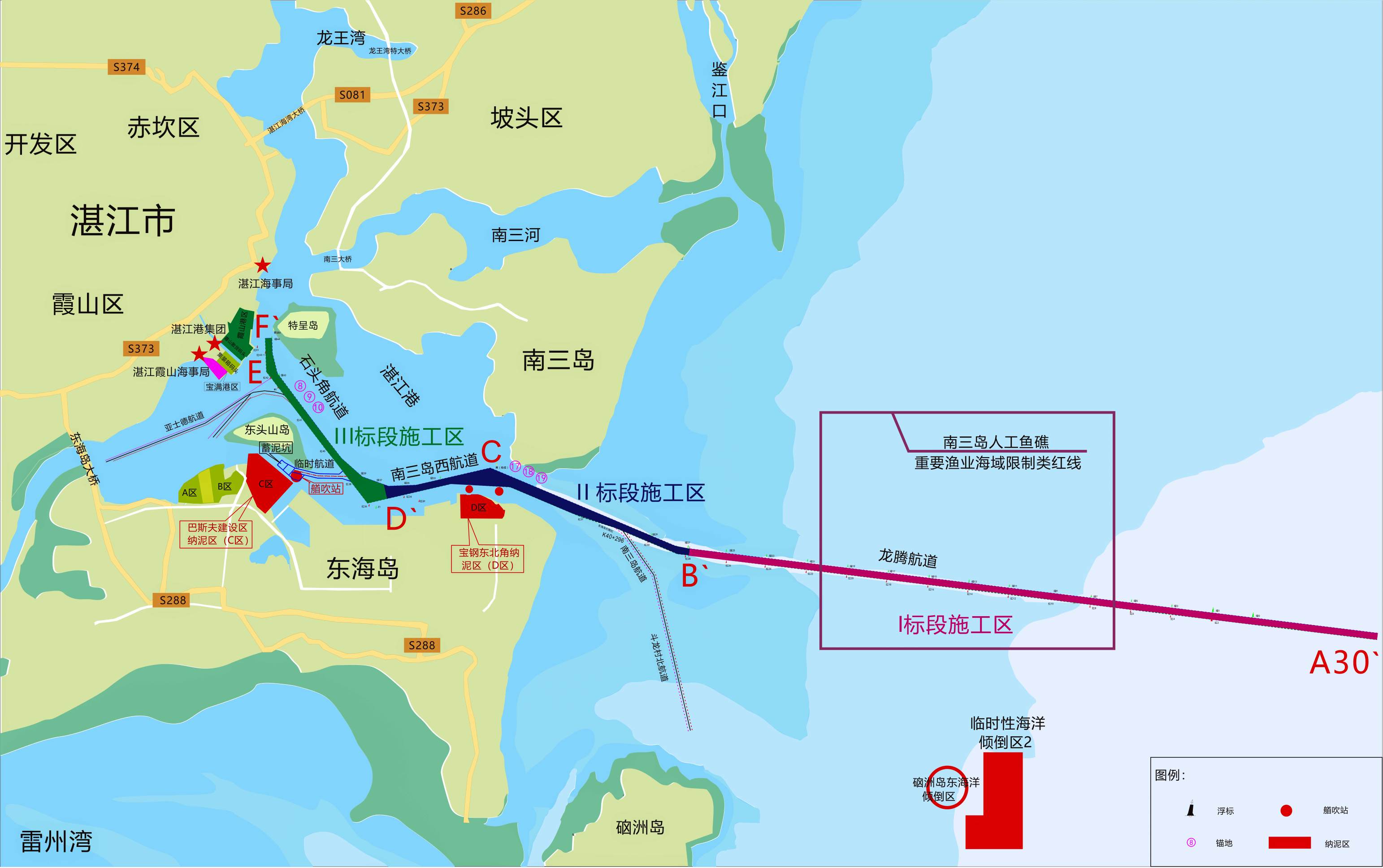 目前在建的40萬噸航道工程,是在原30萬噸航道工程基礎上進行改擴建,將原30萬噸航道起點向外延伸約9.2km,以湛江灣口門為界,分外航道和內航道兩段,共設置4個轉彎段和1個會船區。改擴建後,航道里程為64.1km,航道通航寬度為340m,複合邊坡比為上層1:6,下層1:5,底高程外航道-23.6m,內航道-23.0m,總投資概算約38.66億元。航道建成後將成為廣東首條40萬噸航道,也使湛江港成為全省沿海港口唯一通航40萬噸船舶的世界級深水港和碼頭。