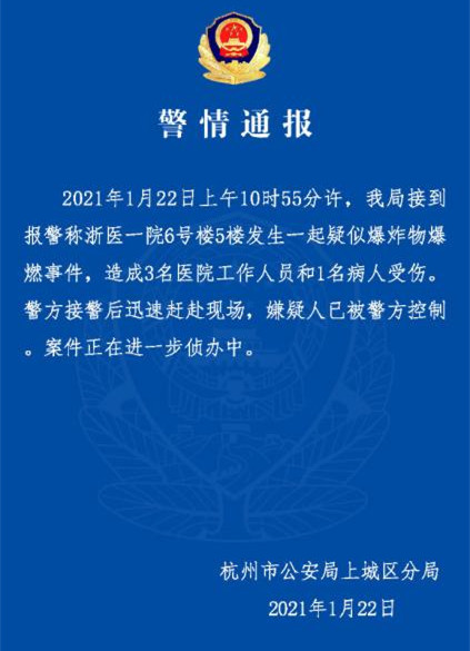 據杭州市公安局上城分局官方微博消息,2021年1月22日上午10時55分許,上城分局接到報警稱,浙醫一院6號樓5樓發生一起疑似爆炸物爆燃事件,造成3名醫院工作人員和1名病人受傷。警方接警后迅速趕赴現場,嫌疑人已被警方控制。案件正在進一步偵辦中。