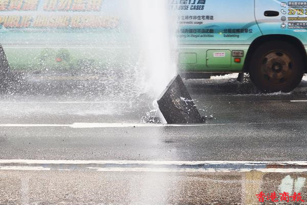 今午(22日)牛頭角道淘大花園對著的馬路有水管爆裂,大量食水沖開渠蓋射出,水柱高達二十多米,路過的汽車都被清洗,交通受阻,水務署已派人搶修。