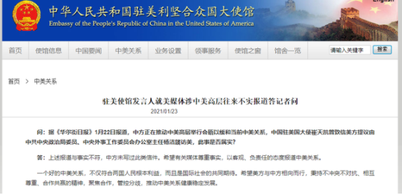 據中國駐美國大使館網站消息,1月23日,中國駐美國使館發言人就美媒體涉中美高層往來不實報道答記者問。