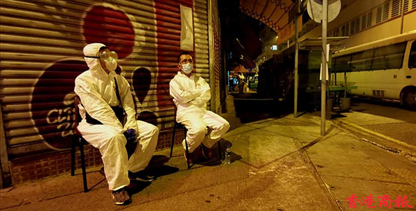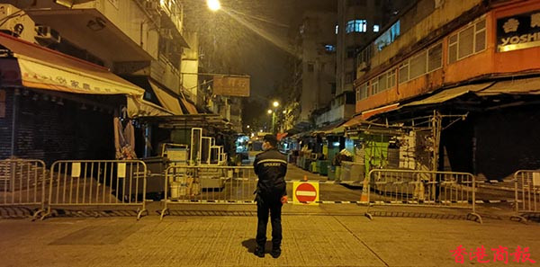 夜風寒涼,記者躲入封鎖區域的臨時物資中心剪片寫稿。零時過後,能感覺到外面漸漸安靜了下來,本來以為此刻的佐敦街面清冷,人迹稀少,但是,一推開玻璃門,一股暖意撲面而來:大街上雖沒有多少行人,惟封鎖區內並沒有停止運作。