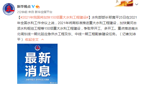 水利部部長鄂竟平25日在2021年全國水利工作會議上說,2021年將高標準推進重大水利工程建設,加快黃河古賢水利樞紐工程等150項重大水利工程建設,爭取早開工、多開工。重點推進南水北調東線一期北延應急供水工程及東、中線一期工程配套建設任務。