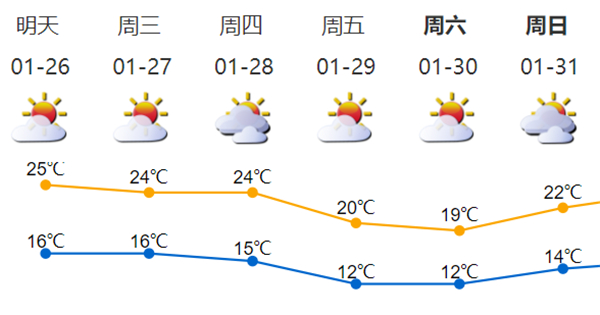 26日晴天間多雲,有輕霧或輕微灰霾;27-28日多雲到晴天,天氣溫暖;
