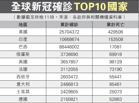 截至昨日晚間,全球累計逾1億人確診感染新冠病毒,達至100039398宗。美國目前仍是全球最多確診及死亡個案的國家,累計確診突破2570萬宗,佔全球總確診人數的四分之一。新冠疫情持續延燒,其中英國等地發現的變種病毒開始蔓延全球,歐洲多國正面臨越來越嚴峻的抗疫局面。