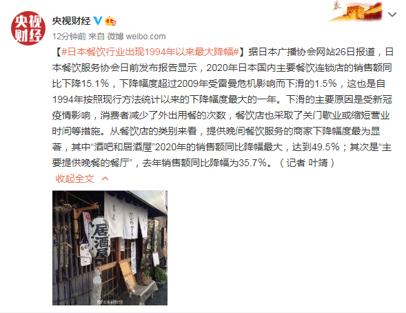 據日本廣播協會網站26日報道,日本餐飲服務協會日前發布報告顯示,2020年日本國內主要餐飲連鎖店的銷售額同比下降15.1%,下降幅度超過2009年受雷曼危機影響而下滑的1.5%,這也是自1994年按照現行方法統計以來的下降幅度最大的一年。下滑的主要原因是受新冠疫情影響,消費者減少了外出用餐的次數,餐飲店也採取了關門歇業或縮短營業時間等措施。從餐飲店的類別來看,提供晚間餐飲服務的商家下降幅度最為顯著,其中「酒吧和居酒屋」2020年的銷售額同比降幅最大,達到49.5%;其次是「主要提供晚餐的餐廳」,去年銷售額同比降幅為35.7%。