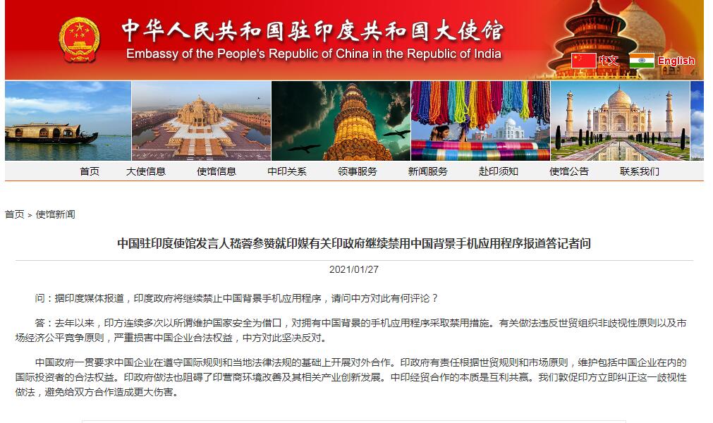 據中國駐印度使館網站消息,中國駐印度使館發言人嵇蓉參贊就印媒有關印政府繼續禁用中國背景手機應用程式報道答記者問。