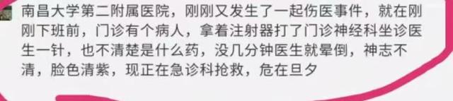 有網友27日發文稱,南昌大學第二附屬醫院發生一起傷醫事件,有病人用注射器襲擊了該院一名門診醫生,醫生隨後暈倒,正在急診科搶救。