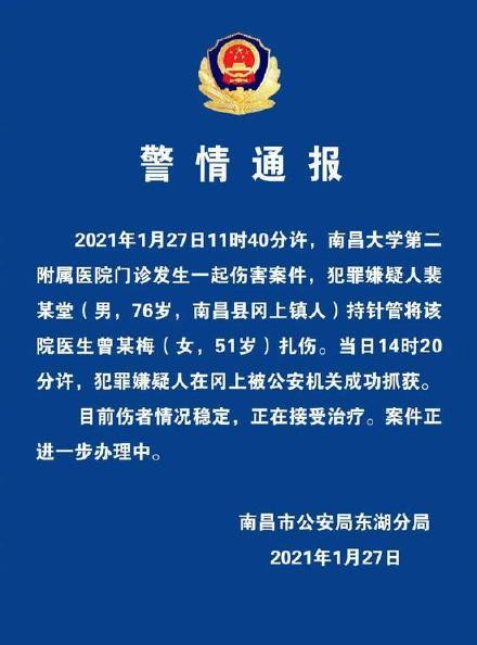 1月27日11時40分許,南昌大學第二附屬醫院門診發生一起傷害案件,犯罪嫌疑人裴某堂(男,76歲,南昌縣岡上鎮人)持針管將該院醫生曾某梅(女,51歲)紮傷。當日14時20分許,犯罪嫌疑人在岡上被公安機關成功抓獲。