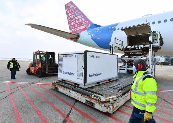 在塞爾維亞首都貝爾格萊德,機場工作人員上周卸載首批由中國國藥集團生產的新冠疫苗。新華社
