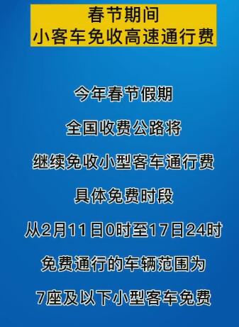 交通運輸部:2月11日至17日小型客車免收高速通行費
