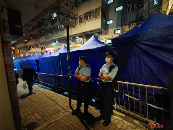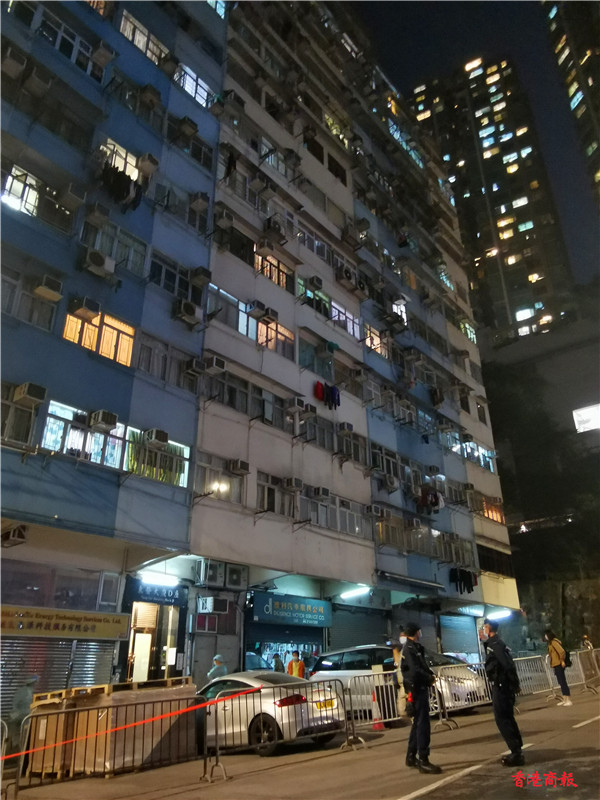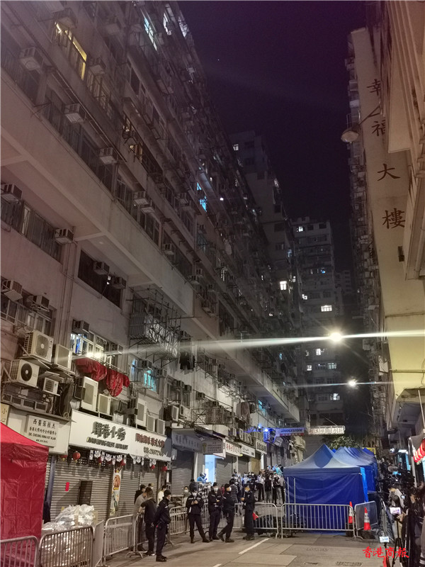 現場所見,大批警員及身穿保護衣的工作人員,当晚約7時已到東發大廈外,警員隨即拉起封鎖線,架設鐵閘及鐵馬。運送物資的貨車亦抵達現場,工作人員陸續架設檢測用的帳幕,並有貨車運送食品及日用品到場。