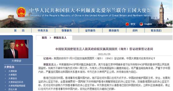 中方表示,將就英國政府後日開放BNO簽證服務,做出有力回應,重申英國為有關人員在英居留和入籍提供路徑,嚴重違背自身承諾及干涉中國內政,亦嚴重違反國際法和國際關係基本準則。中國駐英國大使館指,香港已經回歸中國,絕不容任何外國以任何方式干涉香港事務,中方實施港區國安法的決心堅定不移,反對任何外部勢力干預香港事務的決心堅定不移。