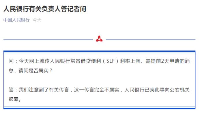 對於網上流傳人民銀行常備借貸便利(SLF)利率上調、需提前2天申請的消息,中國人民銀行有關負責人答記者問時表示:「我們注意到了有關傳言,這一傳言完全不屬實,人民銀行已就此事向公安機關報案。」