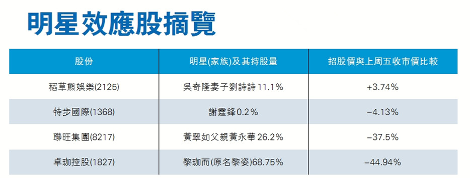 本身由明星或其家族創辦的公司,例子還有上月中上市的劇集製片發行商稻草熊娛樂(2125),吳奇隆雖然為公司創辦人,但未直接持股,而是由其妻劉詩詩持有11.1%股權。該股上市首日股價最高曾較招股價飆93%,收漲83.6%,爆升動力離不開創辦人是紅遍兩岸三地的藝人。該股上市首日股價急升後,翌日同樣回吐,幅度高達30%,近期更持續低位徘徊、成交縮減、反彈乏力。