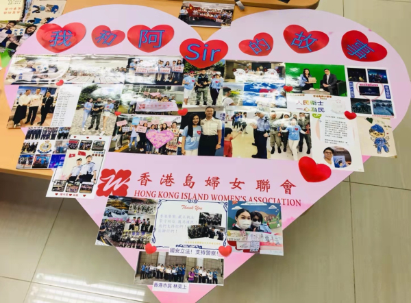 一幅幅的作品,蘊含著動人的故事。據悉,活動主辦方負責人表示是次活動共徵集超過100幅作品照片,致送給警署的作品每張照片背後都蘊含與警察的感人故事。活動負責人指著第一張合照介紹到「去年6月9日黑暴爆發,6月10日港島婦聯是第一個婦女社團前往警署進行慰問,當時港島婦聯前任主席張雅麗腳部受傷,但她不顧自己傷痛,一瘸一拐地帶領姊妹們前往警察總署向警察致以最誠摯的支持與慰問。」「第二張綠色背景的照片也非常寶貴」活動主辦方負責人介紹到「這張是本會金鈴主席採訪警隊一哥鄧炳強的照片。去年,本會金鈴主席力邀香港警務處處長「一哥」鄧炳強就任一周年之際進行採訪,為我們總結警隊重建安全社會所背負的使命及做出的貢獻。」「第三張照片也非常有特色,這是本會副秘書長歐陽鳳盈,作爲「青年快閃·社區清潔」的行動發起人,在黑暴運動之際,勇敢帶領義工清理示威者留下對警察有侮辱性詞語及被污損的牆面,用最實際行動還香港一片乾淨與祥和。」除了照片外,楊張心悅及家人亦錄製視頻,姊妹們親自作詩,寫文章,做賀卡向警察表達敬意。活動負責人表示這每一幅支持警察的照片、每一句對警員的祝福、及每一首的自創詩歌、每一篇的文章都代表了港島婦聯姊妹對於香港警察最深層的敬愛與感謝。