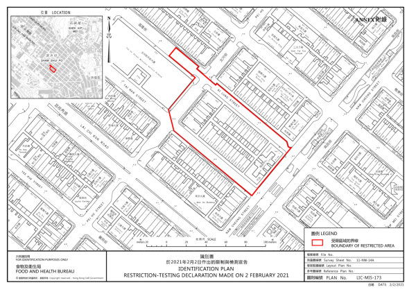 政府今日(2月2日)晚上7時再於佐敦、深水埗及天水圍實施圍封強制檢測。將佐敦長樂街23至27號、長樂街22至28號、志和街13號及彌敦道322-326A號;深水埗介乎基隆街239至263號、南昌街89號、大南街256至280號、北河街60至74號一帶範圍內的17幢大廈;以及天水圍天恒邨恒樂樓,列為指定「受限區域」。特首林鄭月娥、食物及衞生局長陳肇始、民政事務局長徐英偉晚上11時到深水埗「受限區域」視察。