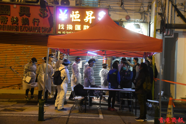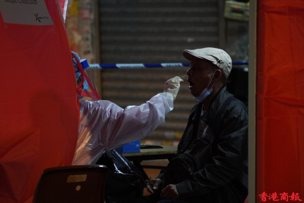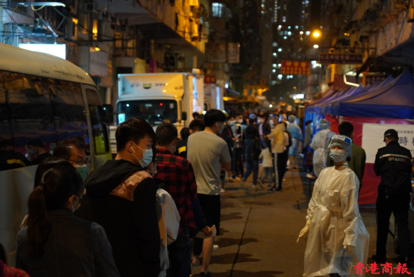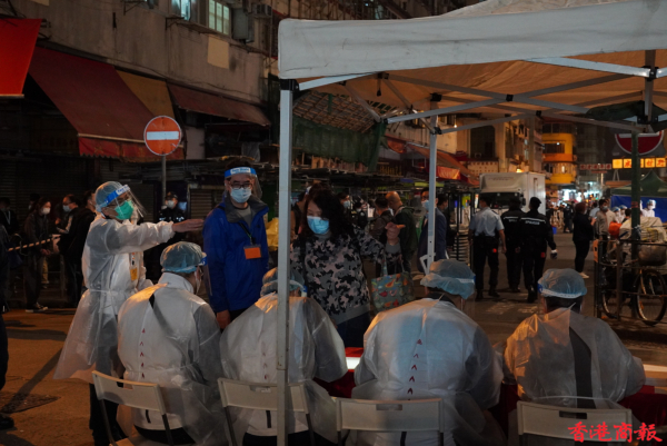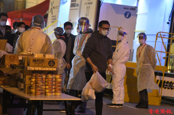 封鎖區佐敦長樂街百樂大廈居民接受病毒測試,並領取食物。(蔡啟文攝)
