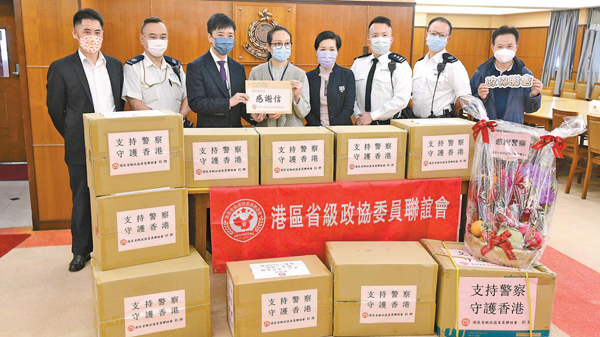 3日下午,港區省級政協委員聯誼會副會長馬浩文和張心瑜來到葵涌警署,他們帶備10多箱口罩、腰果、黑芝麻糖以及一封慰問信。葵涌分區指揮官潘瑞屏警司接過慰問信後,帶他們到警署參觀掛在走廊上一張張於2019年「黑暴」期間拍攝的警署被襲擊照片,並逐一介紹當中細節。馬浩文表示,除抗暴外,警察在抗疫中亦同樣站在最前線,巡邏食肆、防止市民違反限聚令、協助強制檢測等。他說,香港警察的無私奉獻得到社會的充分支持,也得到國家和特區政府的充分肯定,「香港警察你們是好樣的」!