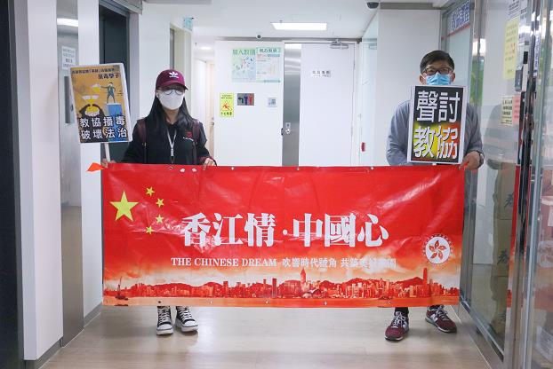 再有市民今日到教協請願,批評教協散播暴力、教壞學生,令他們去做「黑衣人」去「搞暴亂」,更明目張膽在校園鼓吹分裂國家。又指,他們這些教壞學生的做法,並不是老師應有的行為,批評他們只會教壞小朋友,令社會更加分化,故今日前來聲討教協,希望教協能正視問題。(記者何加祺 馮瀚文攝)