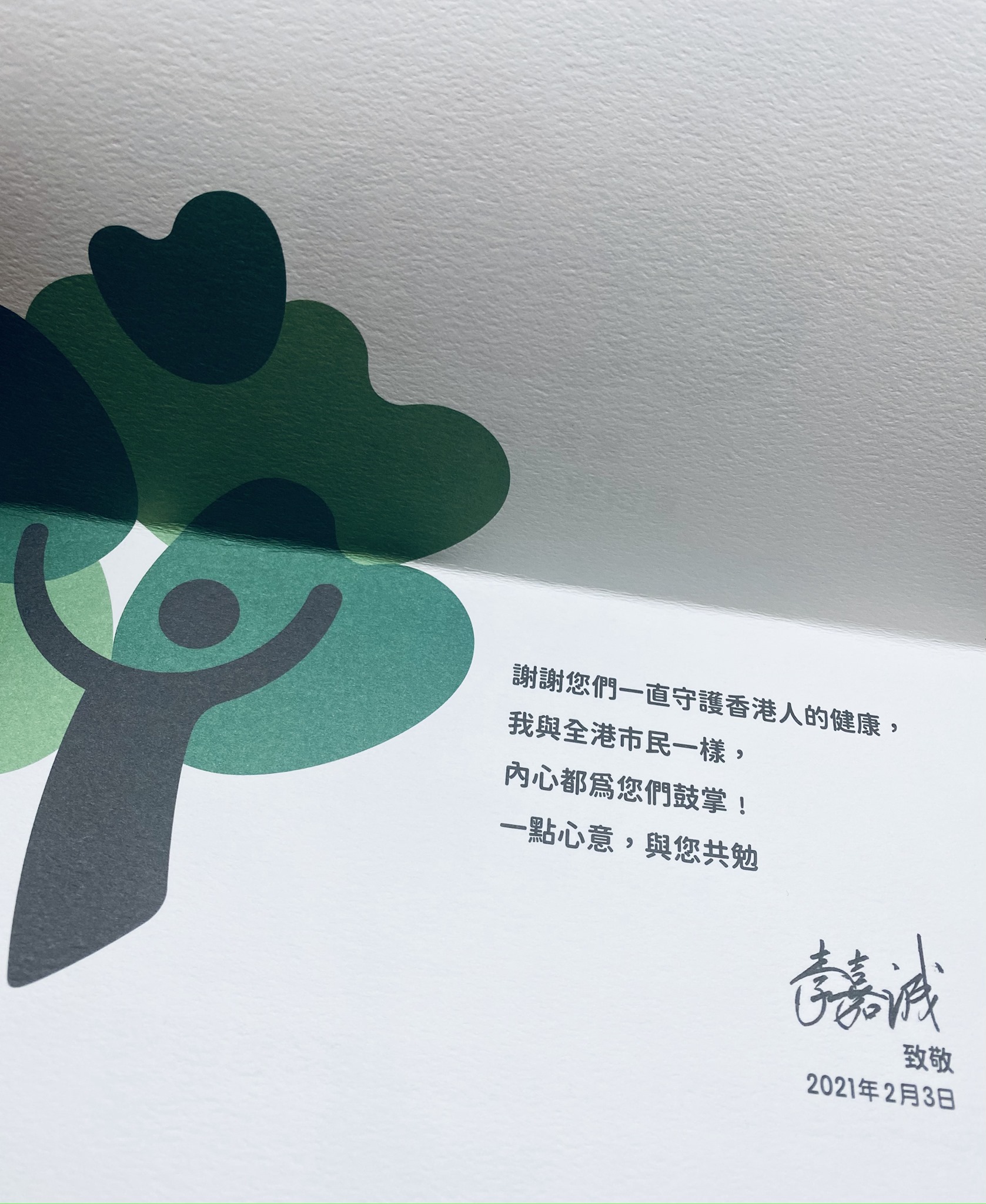 李嘉誠在心意卡上寫道:「謝謝您們一直守護香港人的健康,我與全港市民一樣,內心都為您們鼓掌﹗一點心意,與您共勉  。」
