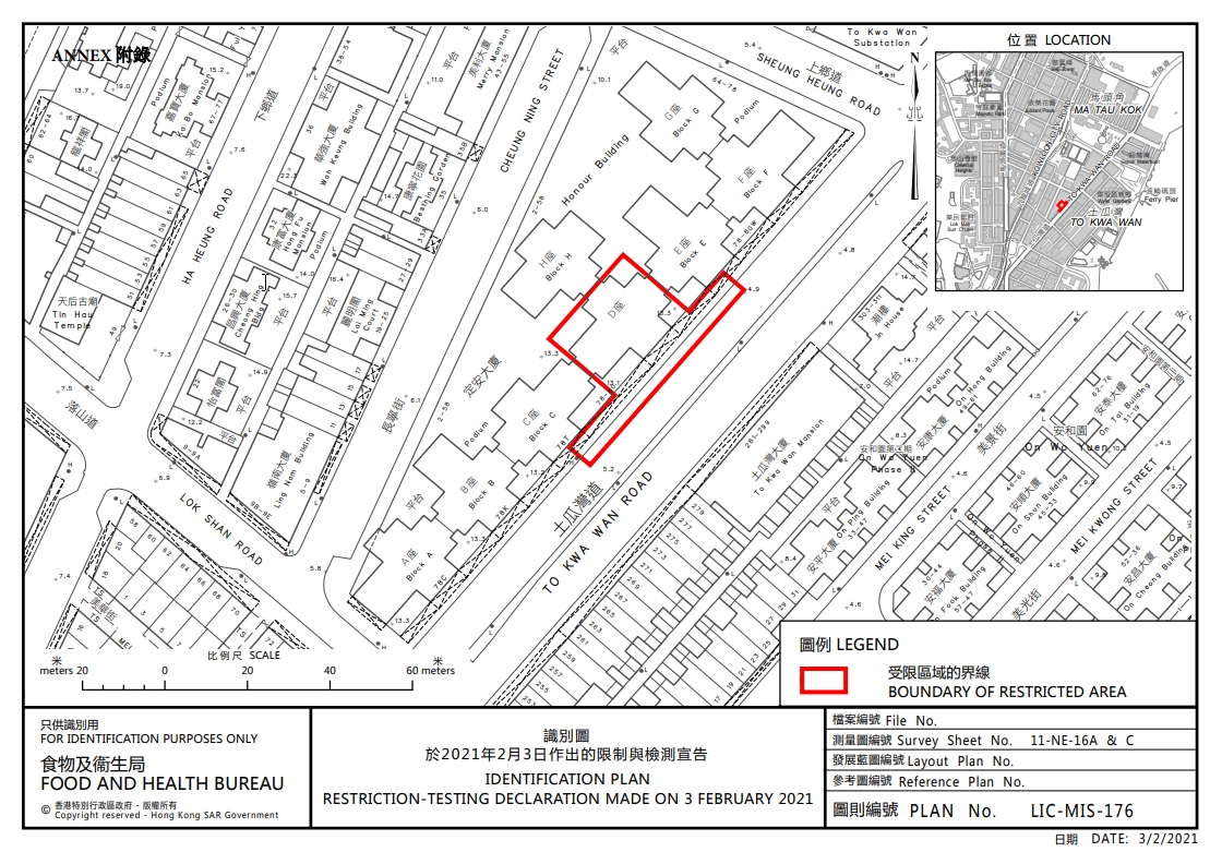 政府今(3日)晚7時宣布引用《預防及控制疾病(對若干人士強制檢測)規例》(第599J章)作出限制與檢測宣告,指自下午七時起限制在柴灣環翠道11號興華(一)邨美華樓,以及屯門海珠路7號豐景園第一座內的人士,須留在其處所並接受強制檢測。受檢人士須在其處所等候,直至區內所有已識別的受檢人士完成檢測,而相關檢測結果亦已獲大致確定,方可離開其處所。政府目標是在4日上午約7時左右完成此行動。