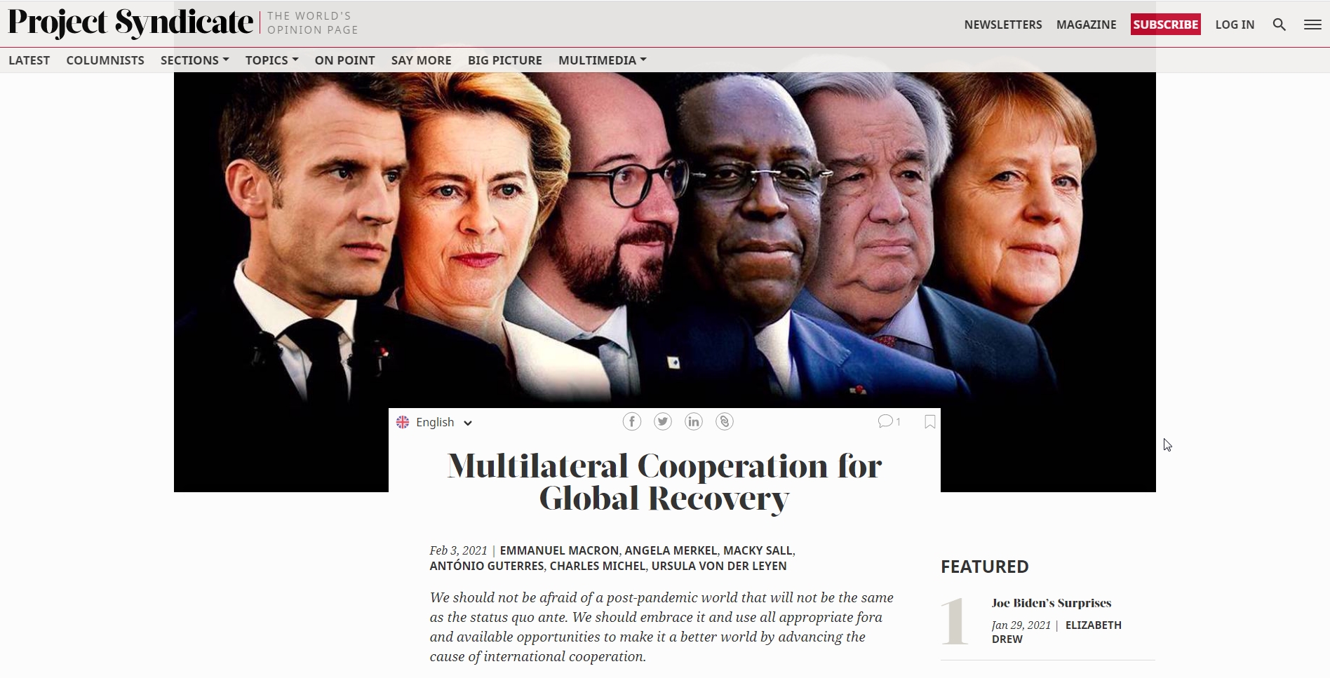 法國總統馬克龍,德國總理默克爾,歐盟委員會主席馮德萊恩,聯合國秘書長古特雷斯,歐洲理事會主席米歇爾,塞內加爾總統薩勒周三在世界報業辛迪加的聯合署名文章中指出,最嚴重的危機要求世界拿出最雄心勃勃的決策。當下或許是通過有效合作、團結與協調,為以多邊主義和法治為基礎的國際秩序重建共識的良好機會。