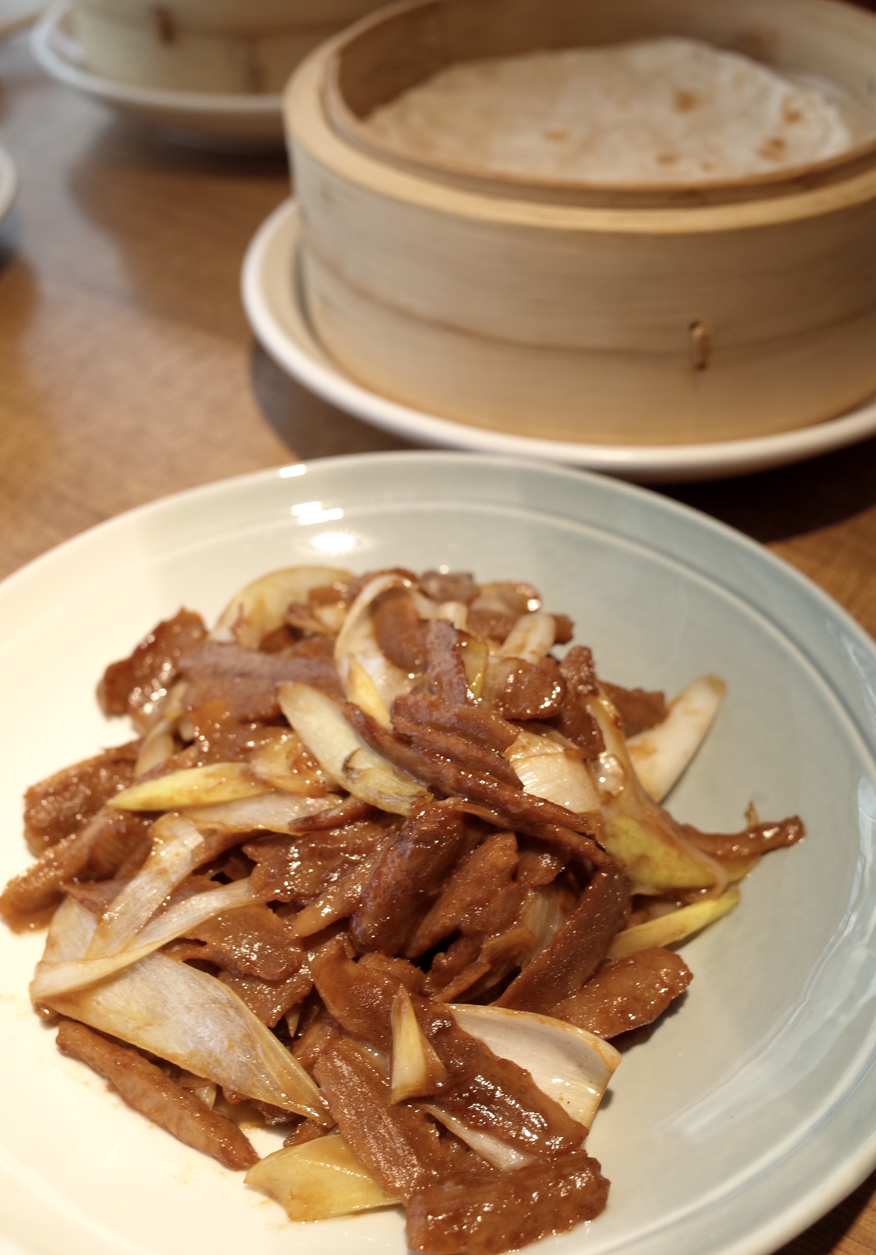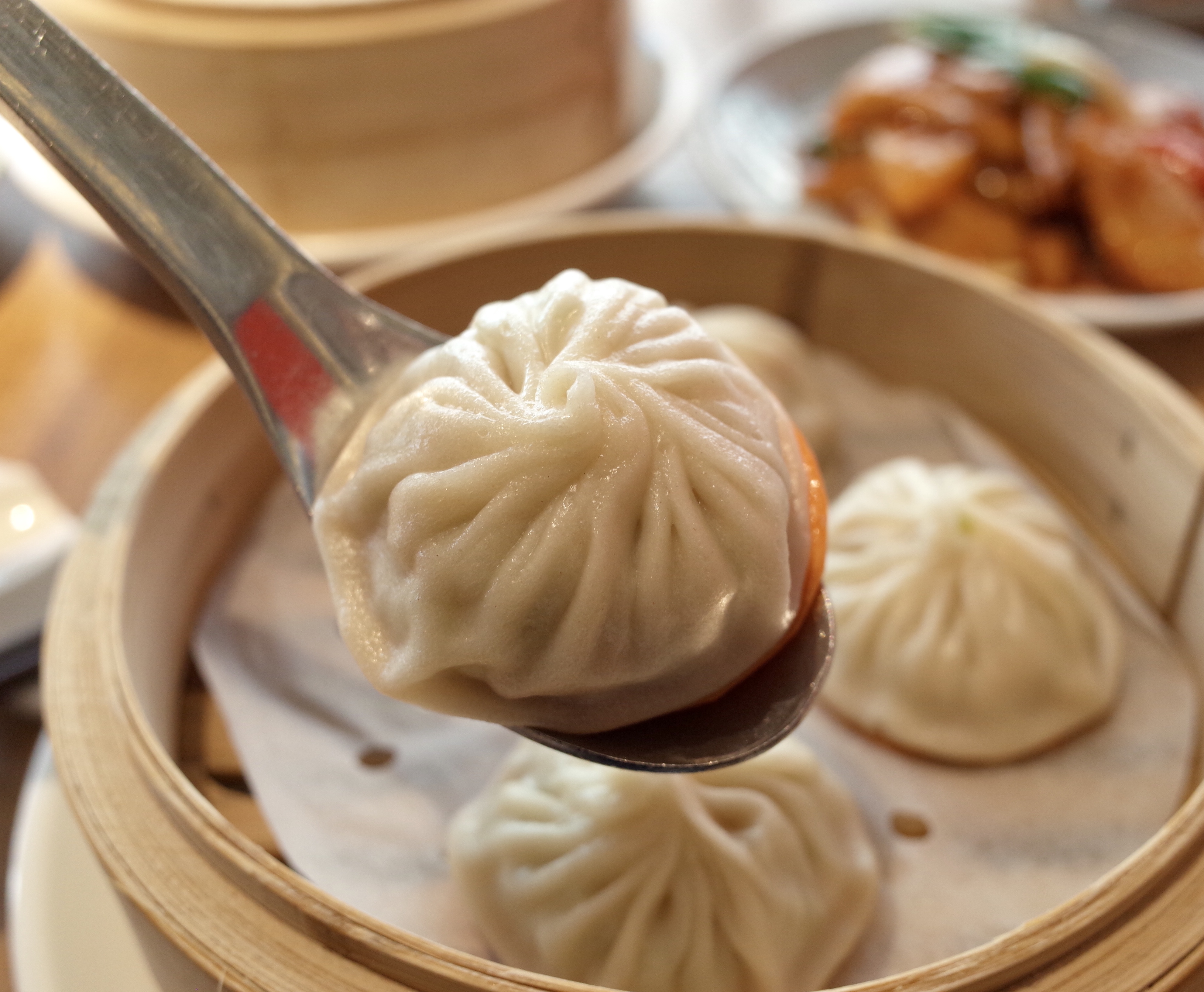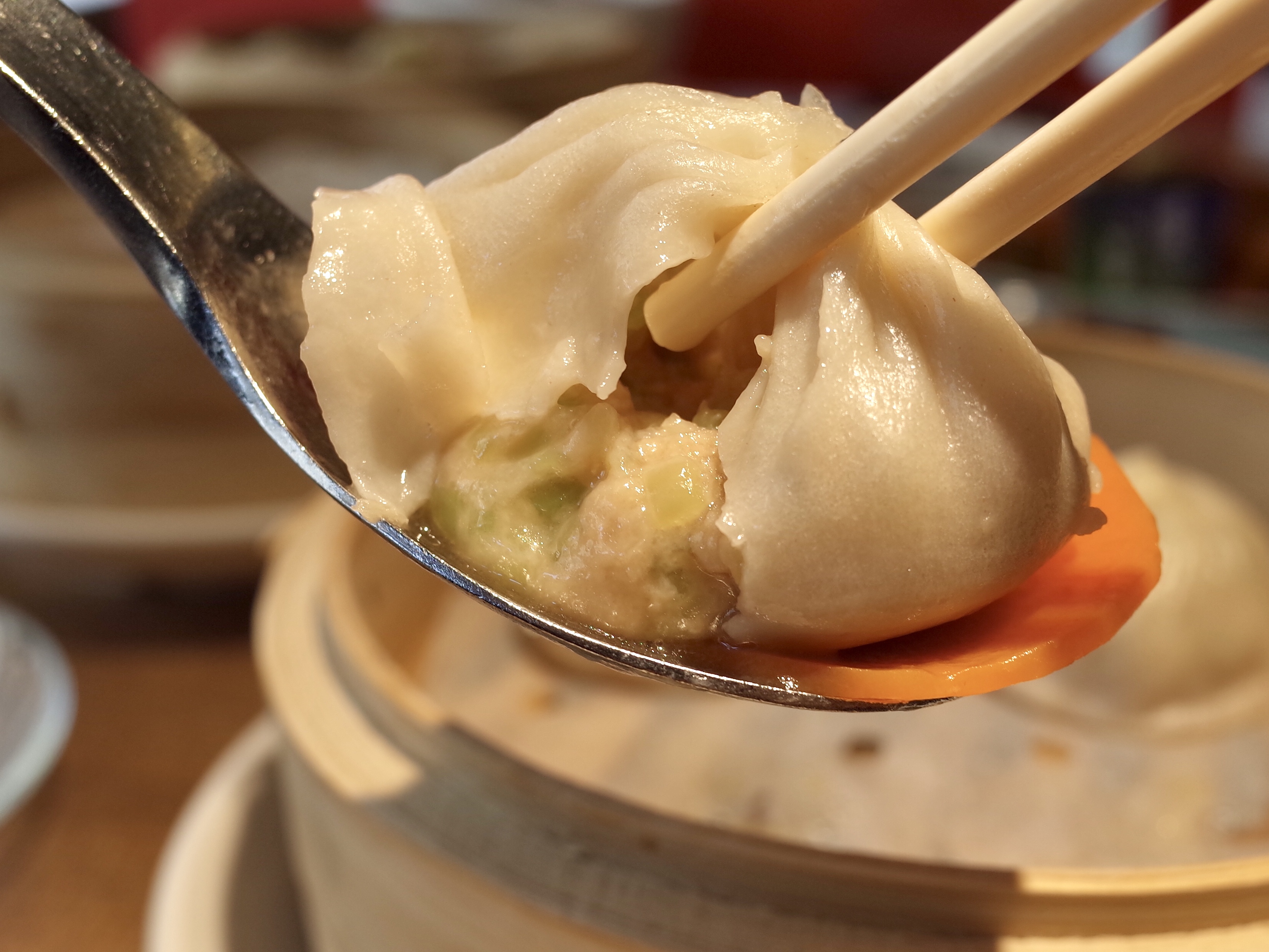 小籠包作為上海菜的代表,製作的每一個步驟都極其講究,由搓皮、備配料、拌肉到手搓的每一步都有其秘方。這次,餐廳將小籠包重新演繹,以OmniPork新豬肉作主要材料,製作出「翡嚐小籠包」。王師傅認為製作的難度在於新豬肉與普通豬肉的口感質地不同:「小籠包是餐廳的招牌菜,製作小籠包的秘訣之一是我們會用不同肉質纖維密度豬肉,進行黃金比例調配。為重塑豬肉小籠包的口感,經過反覆試驗,最後決定用萵筍,不但在於其口感爽脆,能夠增添層次感,更因為萵筍本身亦是江南飲食中用得較多的食材。」萵筍小籠包儘管湯汁不及傳統小籠包多,不過內餡依然有湯汁,整體爽口清新之餘亦不肥膩。