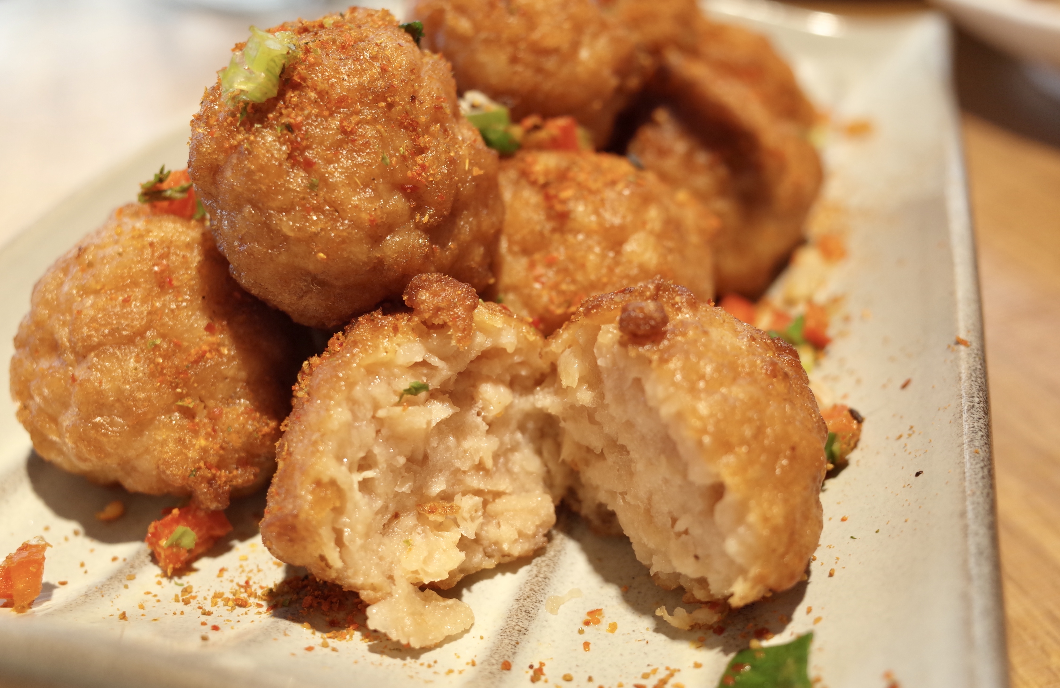 同樣以新豬肉取代傳統豬肉的「七味團圓」,靈感源自揚州名菜獅子頭。「傳統的獅子頭有醬汁浸泡,新豬肉則不能浸泡或放置太久,不能用同樣方法製作。」王師傅在打「肉」丸時特別注意口味和口感,下鍋的油溫與油炸時間也受素肉影響,要格外留意油炸的時間及溫度的掌握。用獨特的調味醃製後下鍋油炸至金黃,再灑七味孜然粉上碟。每一粒炸好的「肉」丸裹上七味孜然粉,香酥惹味,作為小食尤其適合。