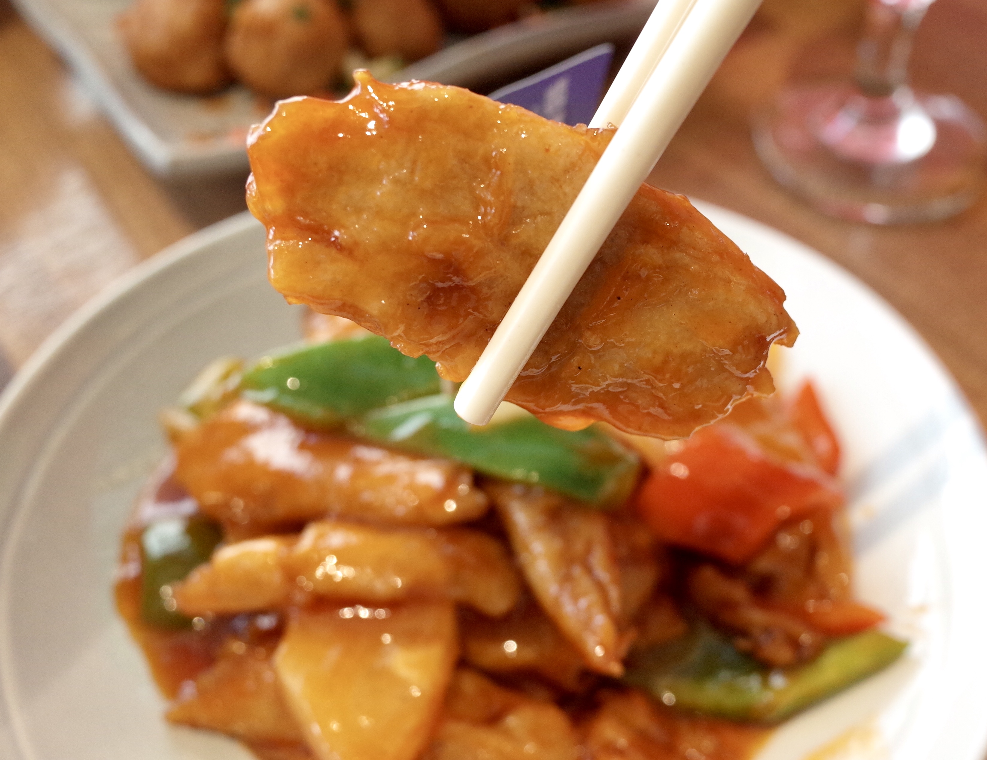 餐廳不但以創新方式演繹傳統菜式,還用素肉為食客帶來熟悉的味道。如「摩登雞柳」所用的糖醋醬汁,便是特地微調過。王師傅解釋,酸酸甜甜的咕嚕肉在醬汁的調控及肉的處理皆講究,「素肉容易吸收醬汁,為還原傳統的味道,因此將醬汁調淡,否則會非常重口味。」「摩登雞柳」色澤油潤紅亮,教人食指大動,味道酸甜可口,糖醋醬汁比例恰到好處,植物雞媲美真雞肉的質感,非常開胃。