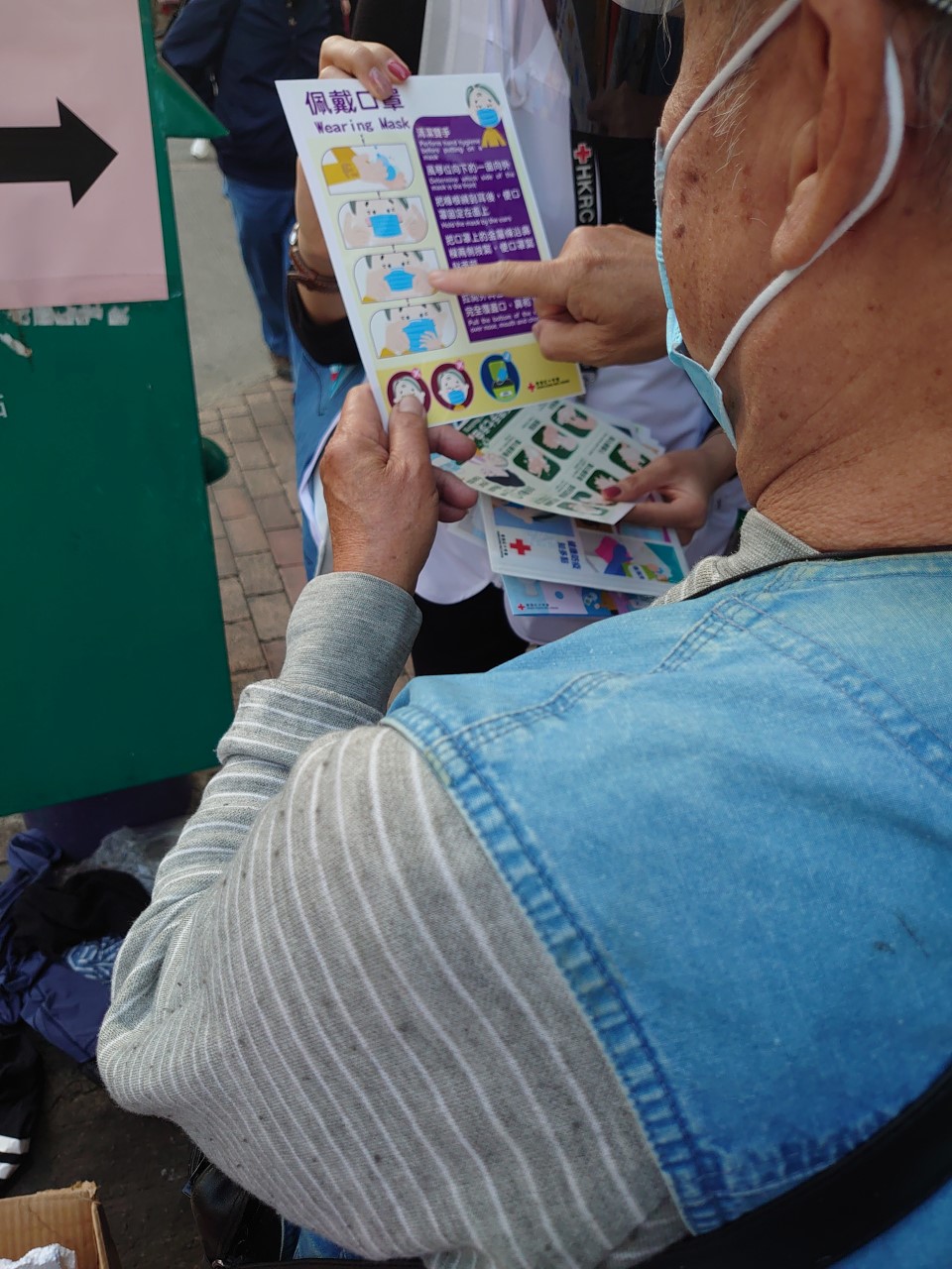 香港紅十字會引述逾70歲的何婆婆指家庭經濟負擔沉重,不能多花金錢去買防疫物資,所以她每晚會以熱水浸泡及清洗口罩,以便重複使用;至於60多歲的王伯伯則被義工及職員發現使用兒童口罩,它只能遮蓋到伯伯四分一面部,而王伯伯表示自己知道口罩不合尺寸,但公屋附近出售的兒童口罩較便宜,故他並不介意使用;紅十字會還指出有雙老住戶的長者表示自己沒有足夠抗疫資訊,不太清楚如何做好防疫措施,而義工則向他們派發防疫用品及正確使用方法,分享防疫資訊並提供日後獲得資訊的渠道。