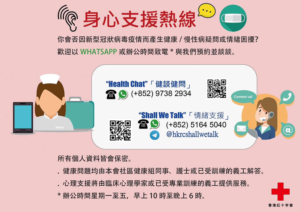 紅十字會為有需要的市民提供身心支援熱線服務,包括心理支援服務 “Shall We Talk”及「健談健問」社區健康教育熱線服務。